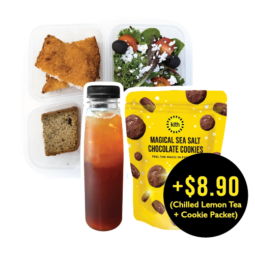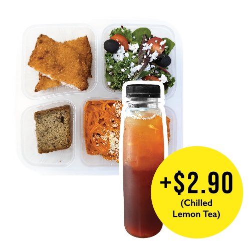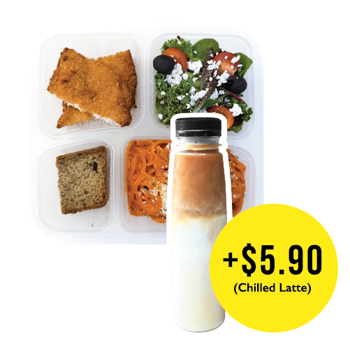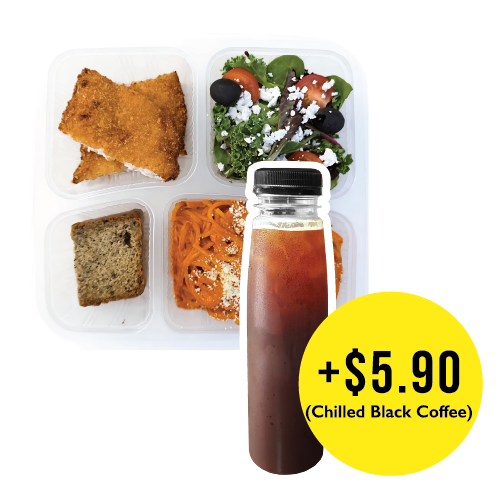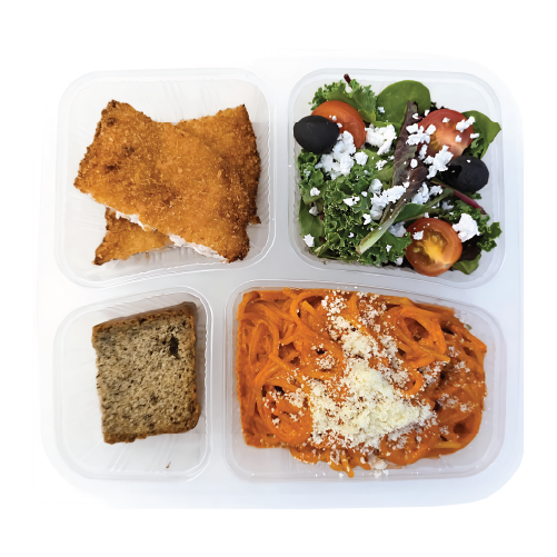 Breaded Fish Fillet, Spaghetti Pasta, Tomato, Cream, Parmesan cheese, Mixed Greens, Tomato, Black olive, Banana Bread